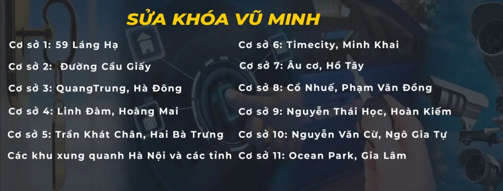 Sửa khóa Vũ Minh là một trong những đơn vị sửa khóa uy tín, chuyên nghiệp hàng đầu Hà Nội. Với đội ngũ kỹ thuật viên lâu năm, giàu kinh nghiệm, trang thiết bị hiện đại. Chúng tôi tự tin KHẲNG ĐỊNH luôn đem đến cho khách hàng dịch vụ TỐT NHẤT với giá thành PHẢI CHĂNG NHẤT.